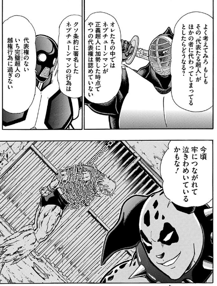 完璧超人始祖は、ネプチューンマンに代表権を認めてないし、その主張は正しいのだが…ラージナンバーズとはいえ一介の完璧超人にすぎないストロング・ザ・武道が言っていいかは疑念あり(大嘘)