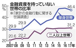 金融広報中央委員会(事務局・日銀)が10日発表した2017年の「家計の金融行動に関する世論調査」によると、2人以上の世帯のうち、将来に備えた預貯金や株などの金融資産を持たない世帯の割合は31・2%(前年は30・9%)と、過去最高となった。資産を持つ世帯が株高の恩恵を受ける一方、持たない者との格差が縮まらない傾向がうかがえる。