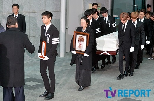 SHINeeのメンバーミンホは悲痛な表情で位牌を持ち、ジョンヒョンさんの姉が遺影を持って後に続いた。他のSHINeeメンバーとイトゥク、ドンへ、ウニョクなどSUPER JUNIORのメンバーが棺を持ち、その後方で少女時代ら同僚、知人が見守った。同僚たちは何も言えず、涙を流すだけだった。悲しみが葬式場を埋めた。