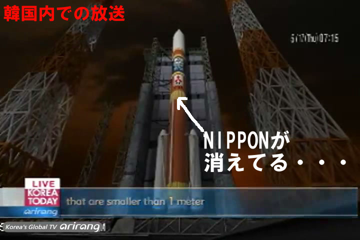>韓国国内の放送では、ロケットの「三菱重工」の文字や、日の丸が消されていたと思います。