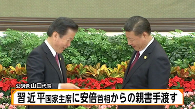 公明党の山口那津男代表は、北京の人民大会堂で習近平国家主席と面会し、安倍晋三首相からの親書を手渡した。山口氏は、日本で開催予定の日中韓3カ国首脳会談の早期実現と、来年の習氏の訪日を要請した。山口氏は習氏の来日を前提に「お会いできるのを楽しみにしています」と伝えた。習氏はにこやかにうなずいたという。見事な事大だと関心はするがどこもおかしくはない