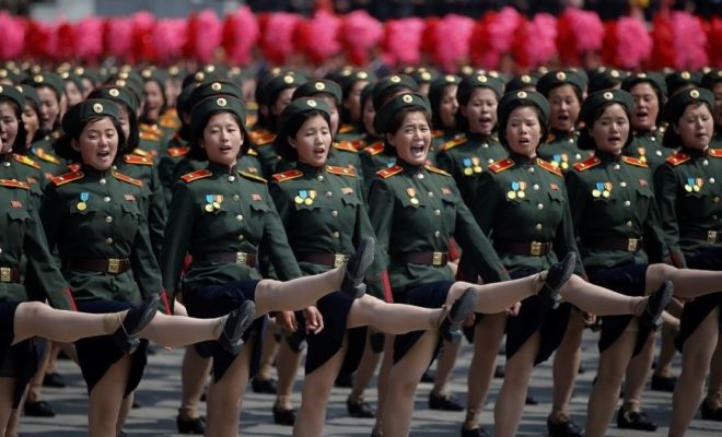 上の写真の女性兵士達を、海外派兵売春外貨獲得部隊員とする。北朝鮮は「〇〇戦闘」のように、いろいろな単語の後ろに「戦闘」をつけるのが好きなようだから、「売春戦闘」の部隊として。