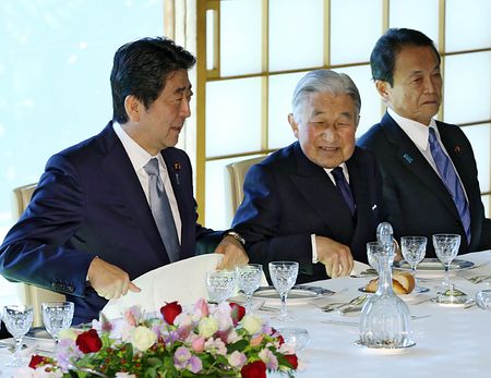 天皇陛下は21日、安倍晋三首相や閣僚、副大臣ら約40人を皇居・宮殿に招き、昼食を共にされた。年末の恒例行事で、皇太子さまも出席した。
