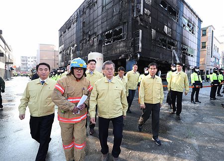 韓国中部・堤川の8階建ての商業ビルで29人が死亡した火災で、文在寅大統領は22日午後、現場を訪れ、救助活動などに関し報告を受けた。また、病院や葬儀場で遺族らに会い、「事故の原因と対応の過程を徹底的に調べ、措置を取る」と約束した。大統領府が明らかにした。