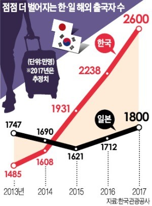 2017년 해외여행으로 한국인은 2600만명 출국. 일본은 1800만명