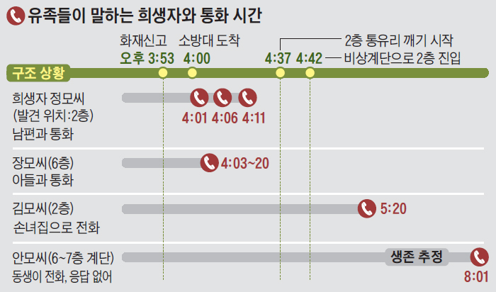 6階で死亡したまま発見されたチャン(64)さんの息子は、「午後4時03分からの火災直後ガラス越しに母を見て、17分間通話した」とした。この時、チャン氏は、夫とも通話をしながら、「窓ガラスがない割れ煙が上がってくる」と話したという。電話が切断されたのは、午後4時20分ごろである。周辺防犯カメラに炎が見えないほどの炎がある程度つかまった時だった。