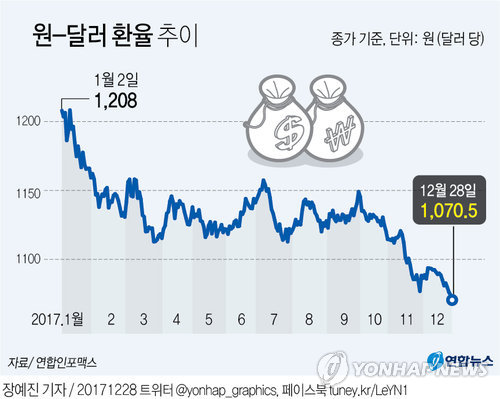 年末ウォン高1070ウォン台割り込む 輸出企業は大丈夫? 2年8ヶ月振り水準