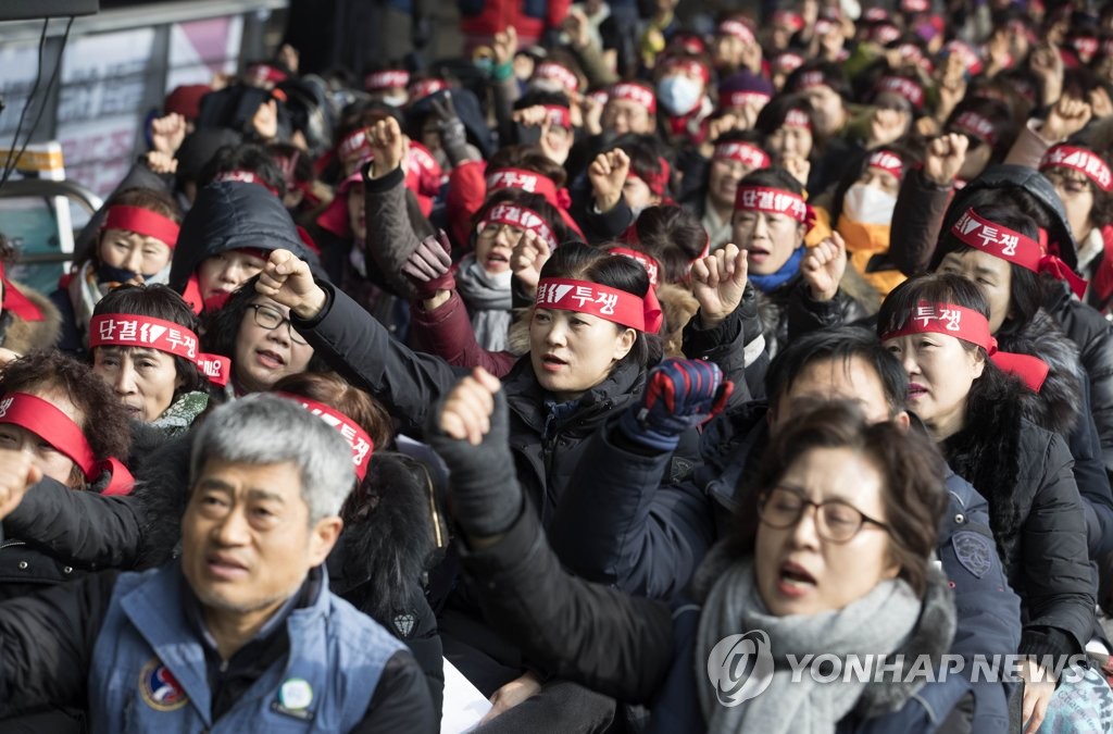 民主労総全国公共運輸労組韓国空港非正規職支部所属組合員200人はこの日午前、仁川国際空港旅客ターミナルからゼネスト出征式を開き、「最低賃金もきちんと支給しろ」と要求した。