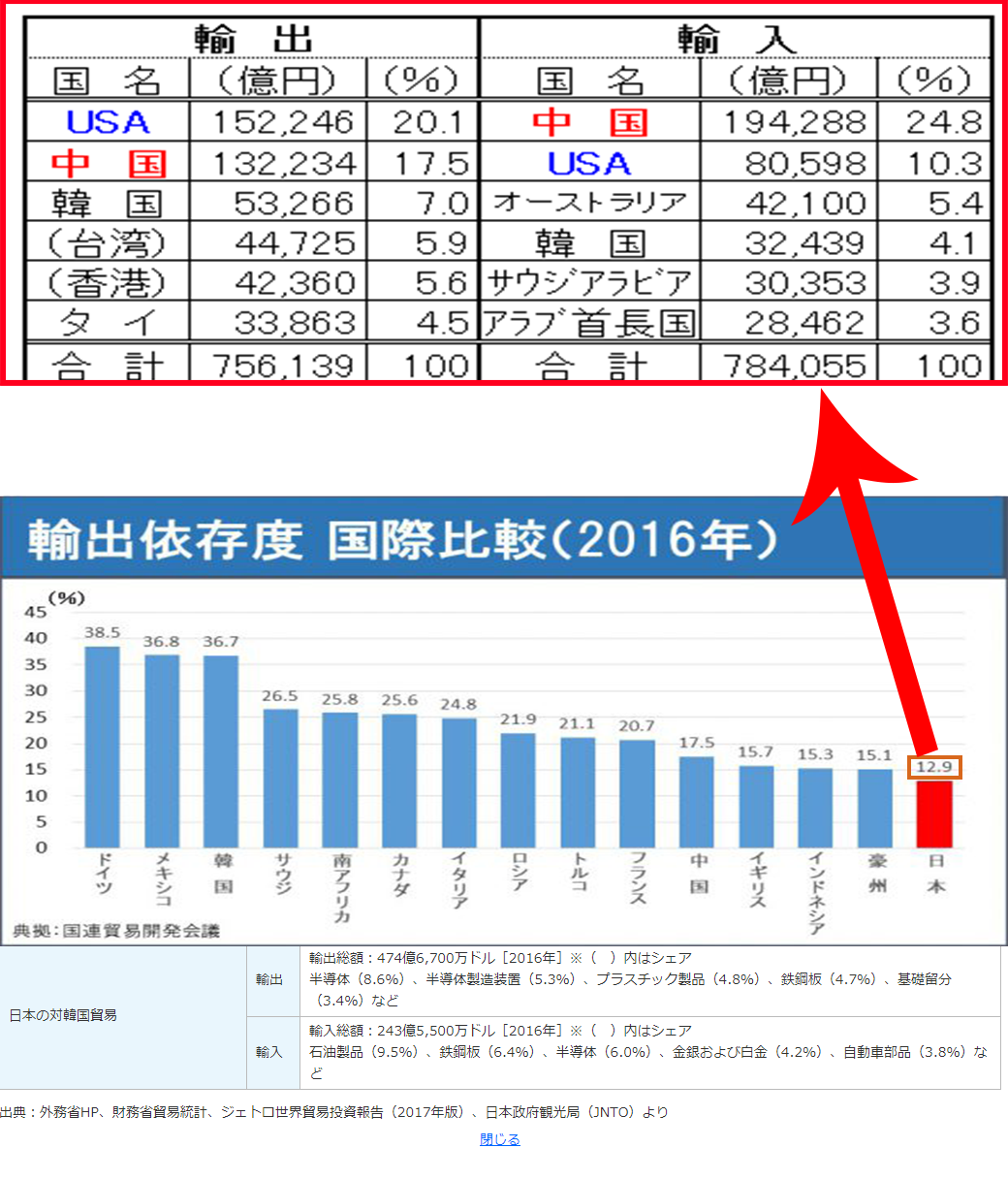 注意:『依存度の話』なので輸出(輸入)依存度=貿易依存度 となる。計算が変だとか、指摘があれば甘んじて受ける。