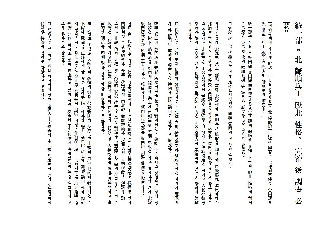 統一部는 15日 板門店 共同警備區域(JSA)을 通해 歸順한 北韓 兵士의 脫北 性格에 對해 "治療가 完治된 後에 歸順動機 等 調査가 必要할 것" 이라고 밝혔다.