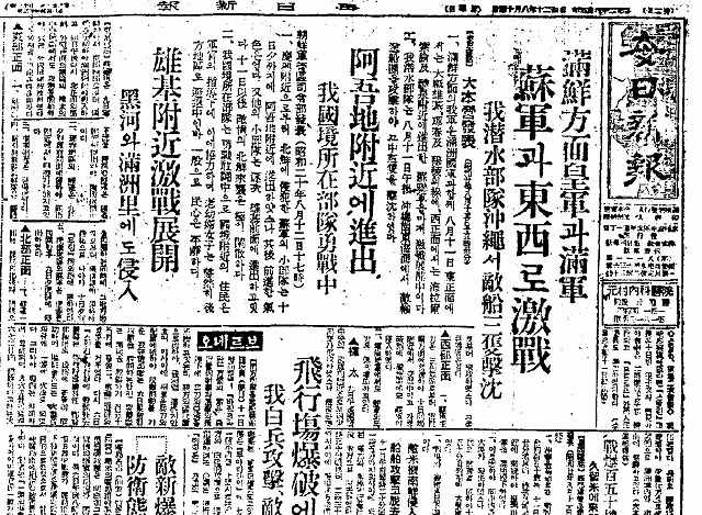 参考までに、終戦直前の(1945年8月14日)のハングル版の新聞。