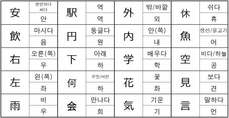 音読み:일, 이, 삼, 사, 오, 육, 실, 팔, 구, 십