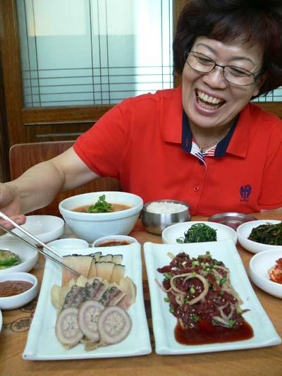 고래고기 전문점 '청해'의 주인 김정순 씨가 고래정식을 소개하고 있다. 냄새와 기름기 적은 고래고기 요리에 백반 정식을 더한 격이다.