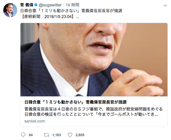 日韓合意「1ミリも動かさない」菅官房長官が強調 BSフジ番組で