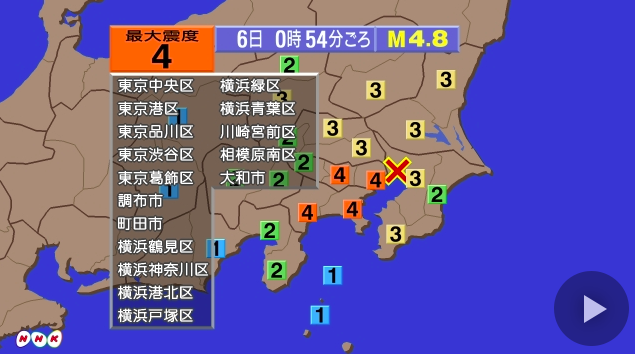 6일 오전 0시 54분께 일본 도쿄와 가나가와현에서 규모 4.8의 지진이 발생했다고 NHK가 이날 보도했다.