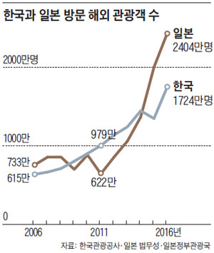 한국은 2017년에 2600만명이 해외를 나갔고, 일본은 1800만명이 해외를 나갔다
