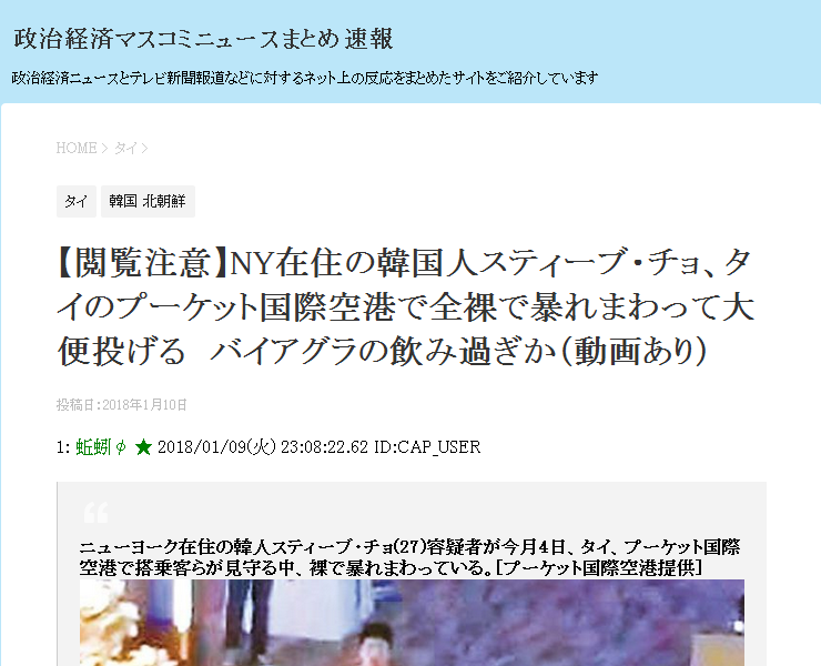 ニューヨーク在住の韓人スティーブ・チョ(27)容疑者が今月4日、タイ、プーケット国際空港で搭乗客らが見守る中、裸で暴れまわっている。