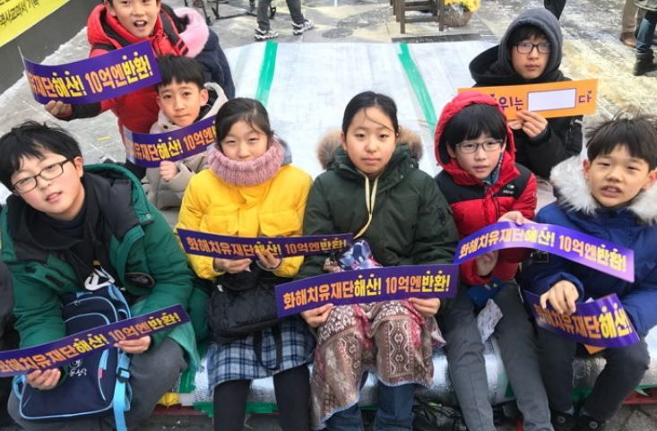 特に、小学生らが紅葉の様に赤くなった手で「和解治癒財団の解散!10億円の返還」という文句が書かれたピケットを持って集会に参加して注目を集めた。