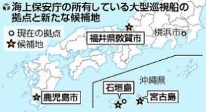 同庁の管轄施設で、1000トン以上の大型巡視船を複数係留できるのは、現在、横浜と沖縄・石垣島の2か所のみ。同庁関係者によると、新たな拠点の候補地には、日本海に面する福井県敦賀市、東シナ海や尖閣諸島に急行しやすい鹿児島市、沖縄県の石垣島と宮古島の4か所が挙がっている。