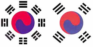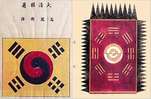 最古の太極旗には、大清国属(偉大なる清の属国)って書いてあるしね。八卦大極図ってやつだな。
