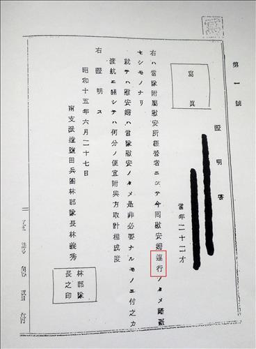 「右の者は当隊に附属する慰安所経営者であり、今回、慰安婦を連れて行くため台湾に戻る者です。就いては、慰安婦は当隊のために是非必要なものなので、この者の渡航に関して何分便宜を取り計らって頂きたい」