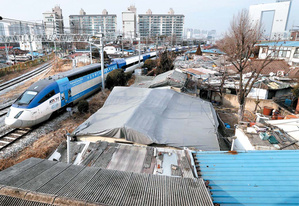 平昌五輪会場に向かう交通手段KTXで最初の駅である龍山駅一帯にバラック小屋が立ち並ぶ。