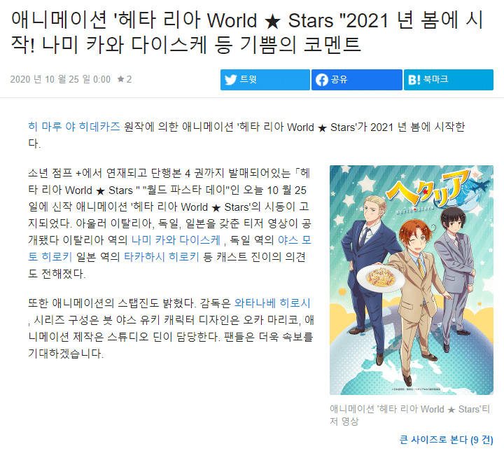 『【韓国】「忘れていたのに・・・」~日本のマンガ『ヘタリア』の新作アニメ・連載再開で嫌韓・右翼議論が再浮上』