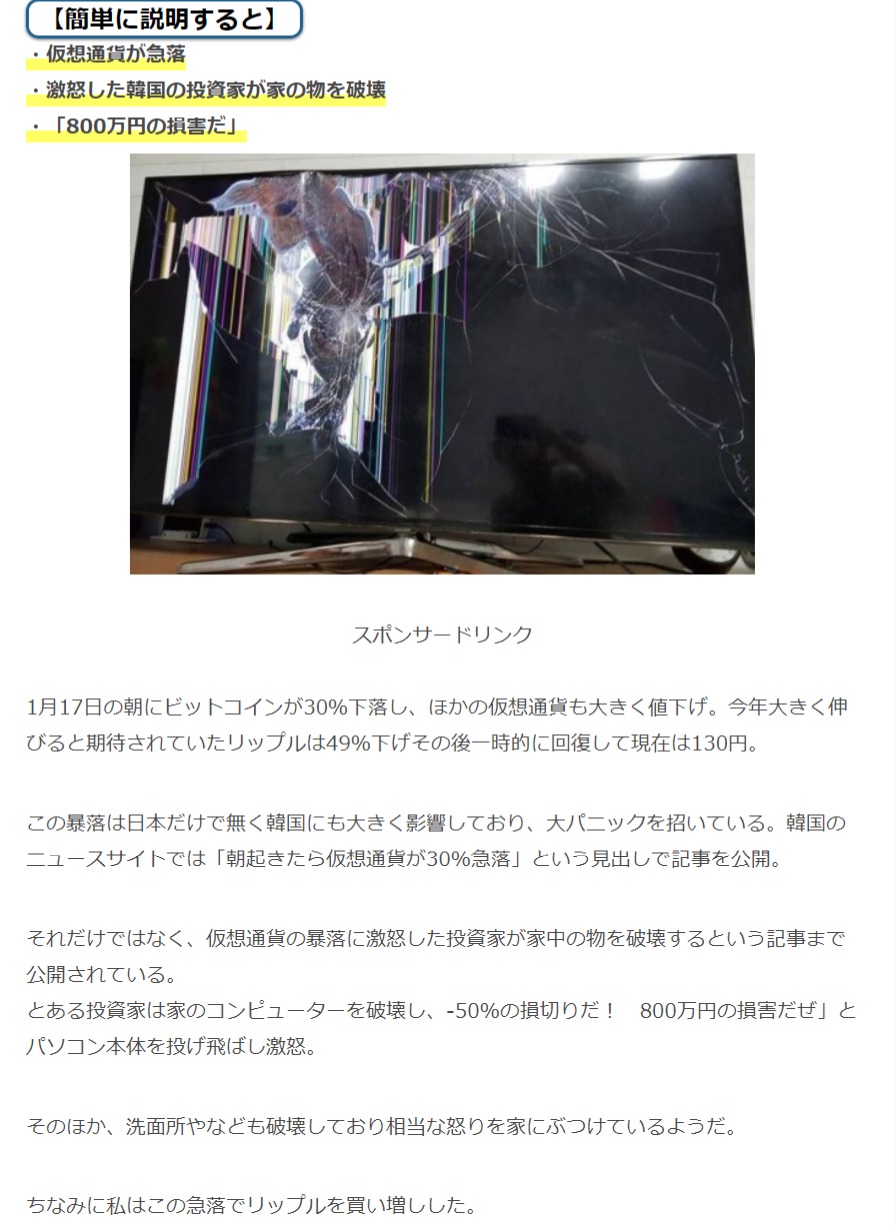 それだけではなく、仮想通貨の暴落に激怒した投資家が家中の物を破壊するという記事まで公開されている。とある投資家は家のコンピューターを破壊し、-50%の損切りだ! 800万円の損害だぜ」とパソコン本体を投げ飛ばし激怒。