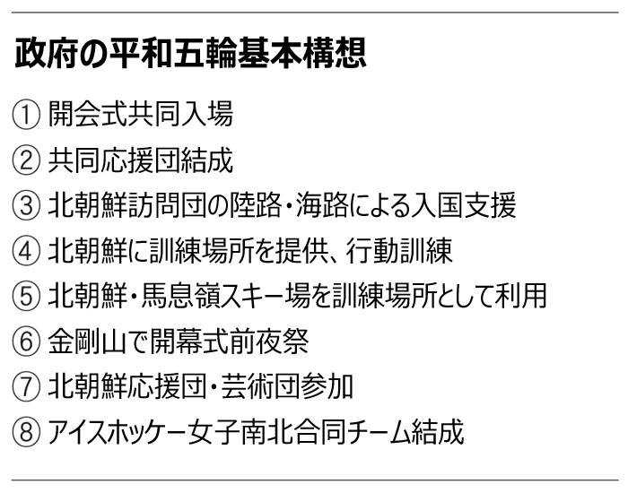 また、統一部が同時に公開した文書「平和五輪基本構想」の内容のほとんどが、同日の南北合意文に含まれていた。8項目からなる基本構想は▲南北選手団の開会式合同入場▲南北合同応援団結成▲北朝鮮側選手団と応援団の陸路・海路入国支援▲北朝鮮側に事前訓練地提供・合同訓練▲北朝鮮側の馬息嶺スキー場利用▲五輪開会式前夜祭を金剛山で開催▲北朝鮮応援団と芸術団の参加▲アイスホッケー女子南北合同チーム結成となっている。