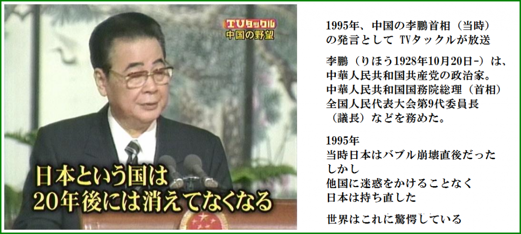 「中国の首相が20年後に日本は無くなっている。」と言ったと1995年に放送しているから発言したのは1995年より前。