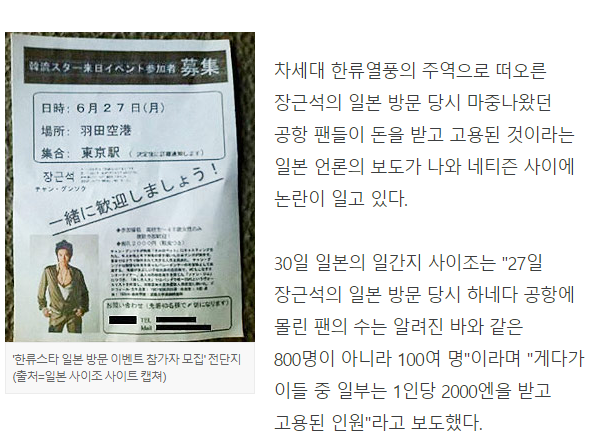 27日、チャン・グンソクは日本訪問00時、羽田空港に集まったファンの数800人と自身(ブログ)で公表したが、実際は100人余りであった。さらに、これらのファンのうち1人当たり2000円で来たアルバイトファンと報道した。