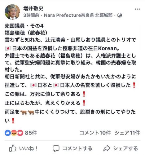 フェイスブックに書きこまれた目を覆いたくなるような文言。投稿していたのは奈良県安堵町議会の増井町議(59)です。増井議員は今月20日、従軍慰安婦問題に絡めて特定の国会議員を名指しして書き込みました。また、総理大臣経験もある別の国会議員については…