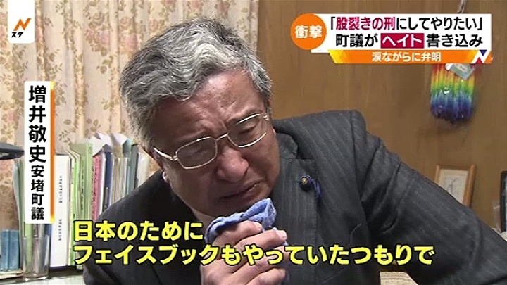 特定の国会議員を名指ししてのフェイスブックへの書き込み。奈良県安堵町議会の増井敬史町議(59)による投稿です。批判を受け、24日は涙ながらに謝罪していました。