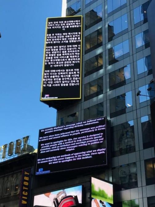 広告代理店は、25日(現地時間)午後看板に掲示した謝罪文で「偽ではなく、本当の誕生日のお祝いメッセージとされる広告を送出した」とし「送出し、そのメッセージに政治的に敏感な内容が含まれ、特に韓国では、多く人が不快にしたというニュースに接した」と述べた。