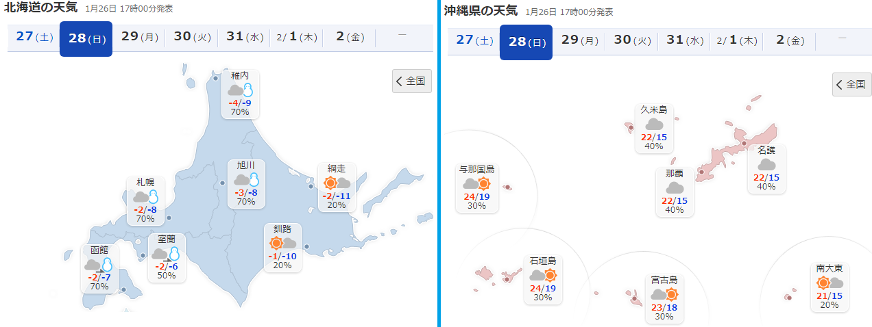 日本の沖縄各諸島、日曜日は少し気温が上昇するようだね。平昌に雪あるの?