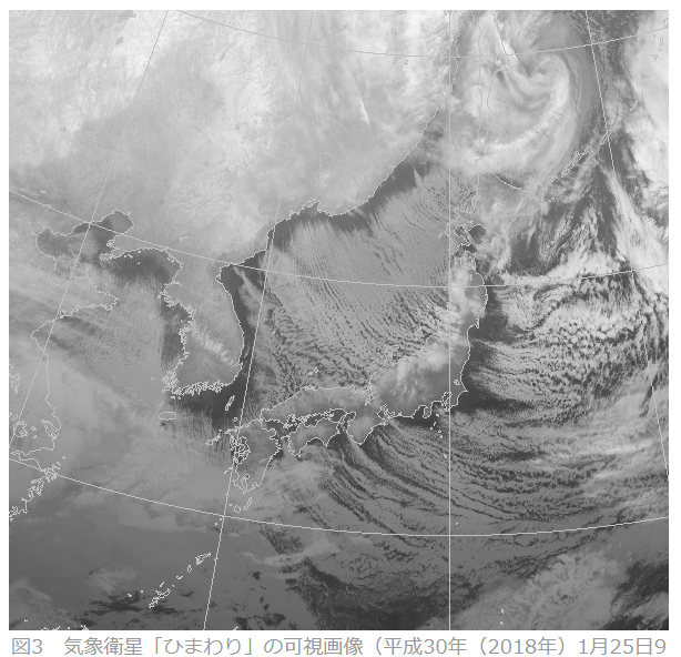 気象衛星「ひまわり」は、強い寒気の南下に伴って日本海で発生した雪雲が日本海側の地方に流入し、大雪となっていることを示しています。しかし、朝鮮半島の上には雪雲はなく、朝鮮半島がはっきり見えています。