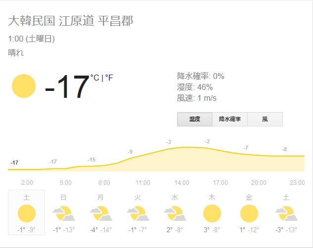 今シーズンの平昌は、平成29年(2017年)11月4日に初雪を観測し、11月26日に積雪16センチを観測しました。平昌でまとまった雪が降り、オリンピック予定会場が雪で白く染まったというニュースが流れましたが、このときは、朝鮮半島北部を通過した低気圧に伴う寒冷前線が通過したことによる雪です。