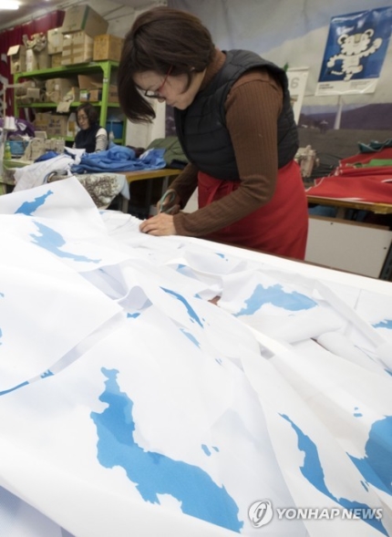 合同チームによる4日の練習試合で、会場に掲げられた統一旗に韓国が領有権を主張する島根県の