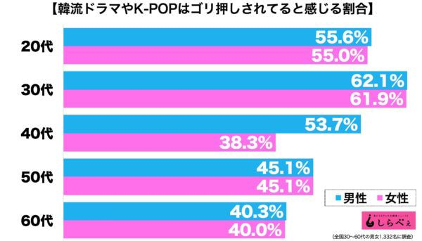 「韓流のゴリ押し」を全国20〜60代の男女1,332名を対象に調査を実施した。