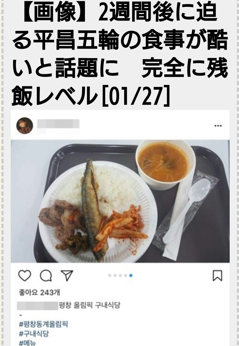 去る25日、平昌冬季オリンピックのためにスノーボード競技場普光フェニックスパークで働いているし、オペレーティングスタッフはインスタグラムに長い長文の文と一緒に同じ日の朝の食事の写真を公開した。