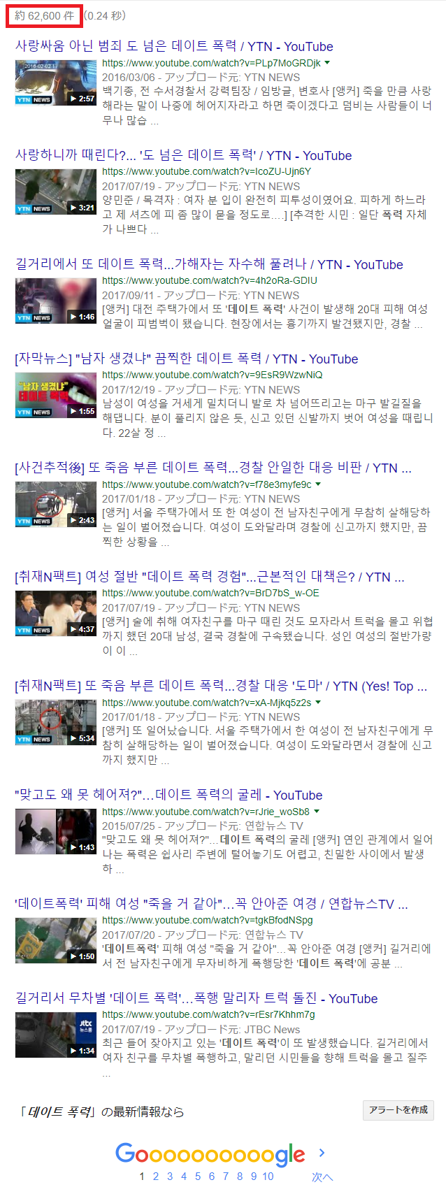 Youtubeで「데이트 폭력(デート暴力)」と検索すれば、6万2400件動画UPされている。