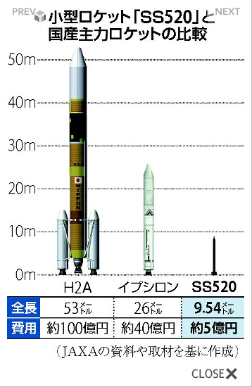 SS520は大気上層を観測するため開発された2段式の固体燃料ロケット。5号機はこれを全長約9・5メートルの3段式に改良し、衛星を搭載できるようにした。
