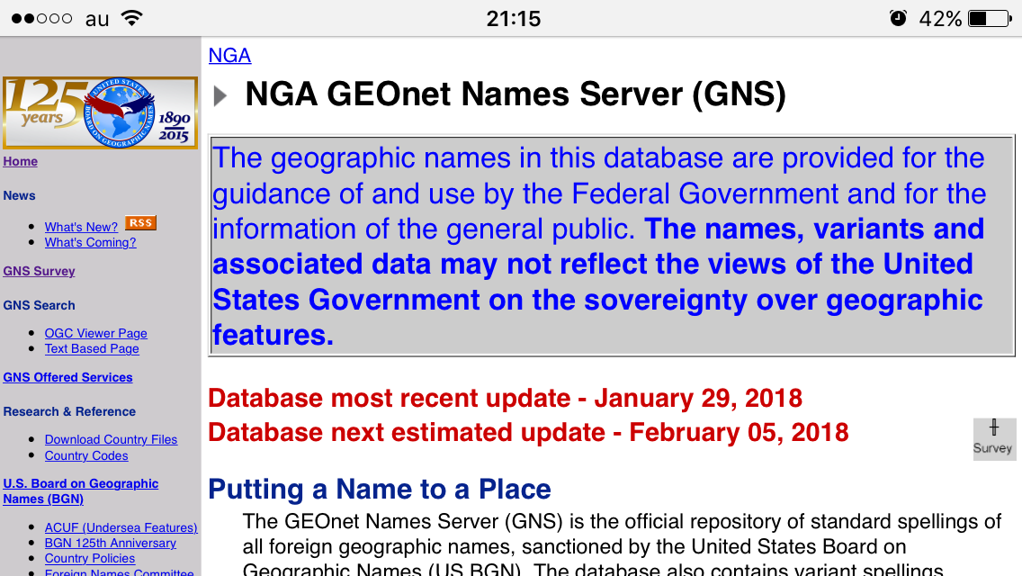 The geographic names in this database are provided for the guidance of and use by the Federal Government and for the information of the general public. The names, variants and associated data may not reflect the views of the United States Government on the sovereignty over geographic features.>>126