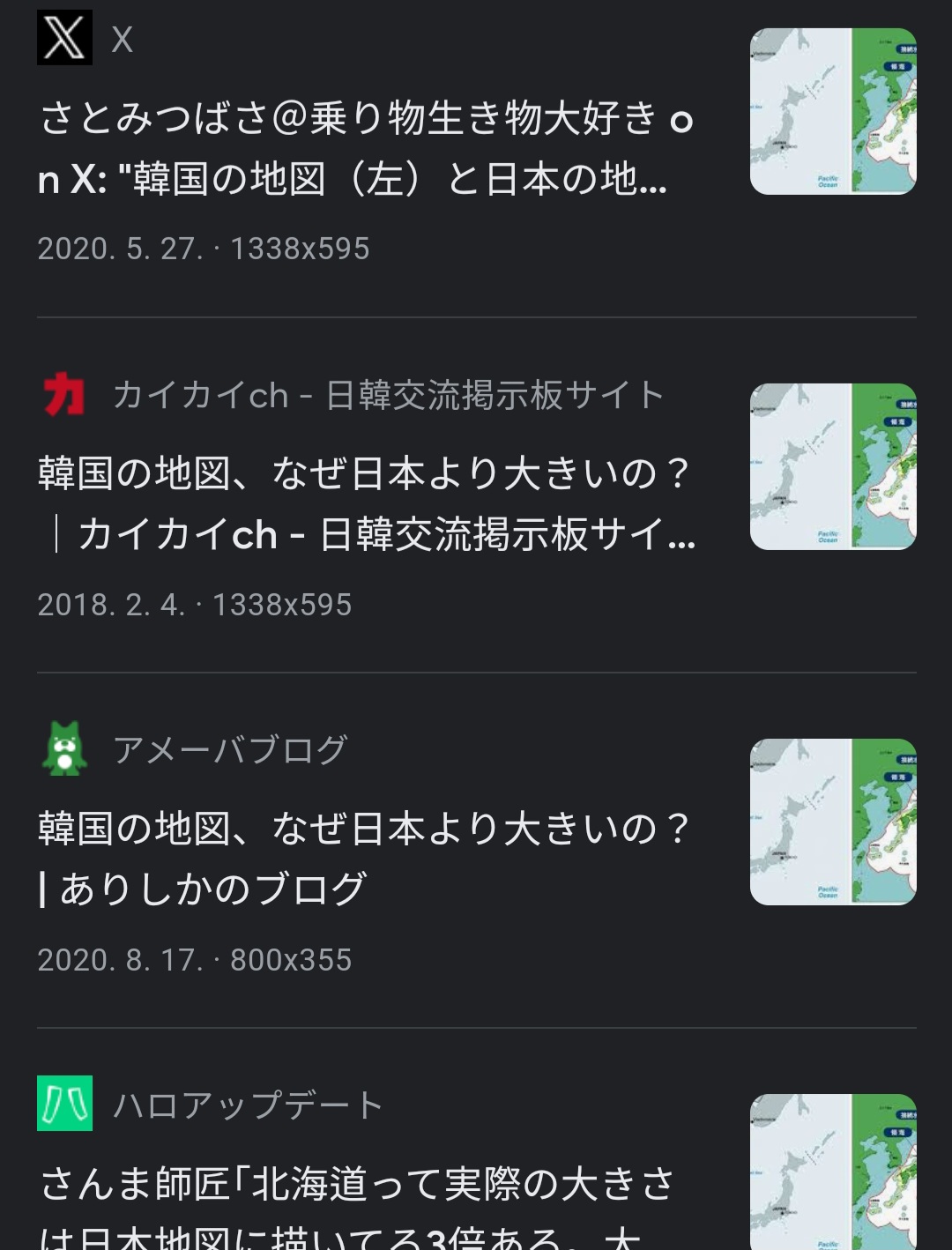 Google에 이미지 검색을 해 보면 전부 일본어의 검색 결과밖에 없네요. 전부 '한국이 자국을 크게 만들어 가르치고 있다'라는 정체 불명의 정보 투성이네요. '한국인이 공자가 자기 나라에서 왔다고 주장한다' 라는 류의 혐한 거짓말입니다. 지도를 합성한것은 넷우익이겠지. 이상한 통계를 검증 없이 가져와서 한국을 마운트 하는것도 그렇고 정말 열도인의 지능이 낮음에 놀라네요.>>230