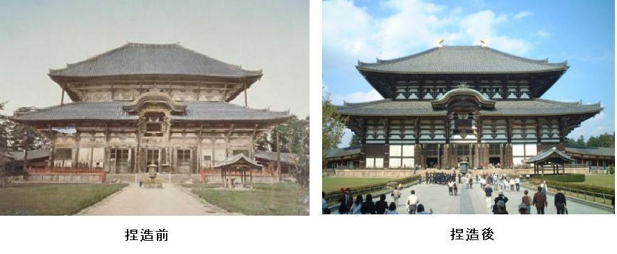 もう一つの寺は東大寺大仏殿と思われるが、古い写真は屋根の左右が垂れ下が