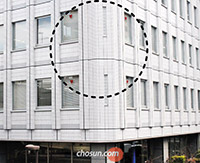 ▲「ここに助けに来て!」――東京・港区にあるビルのガラス窓には赤い逆三角形の表示が付いている。火災など非常時にはここから救出してほしいという意味だ。/東京=イ・ドンフィ特派員