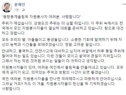 5日ムン・ジェイン大統領は、自分のFacebookの「平昌冬季オリンピックのボランティアの皆さん、愛しています」と、これらを励ます文を掲載した。