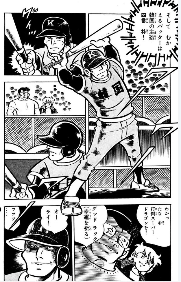 ①日本チームの魔球の対抗策(技術)をアメリカ人に教わる、「韓国人顔のお約束」をよく表現した、韓国チームの主将。
