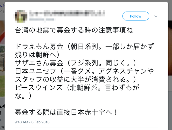 2月6日に発生した台湾東部での地震をめぐり、「台湾の地震で募金する時の注意事項」として、「ドラえもん募金、サザエさん募金は一部しか(被災地に)届かず、残りは朝鮮へ」「日本ユニセフはアグネス・チャンやスタッフの収益に大半が消費される」などと記されたツイートが拡散されている。