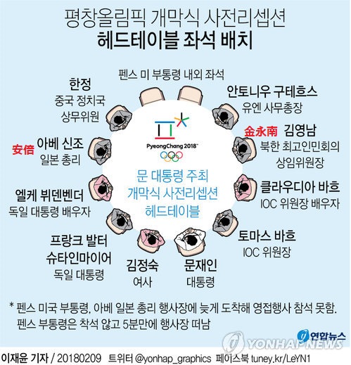 キム・ヨンナム北朝鮮最高人民会議常任委員長とマイクフェンス米副大統領、日本の安倍晋三首相、限定中国商務委員など、韓半島問題の当事者である北米の日のトップクラスの人事が9日、ムン・ジェイン大統領が主催する平昌冬季オリンピック事前レセプションに参加した。